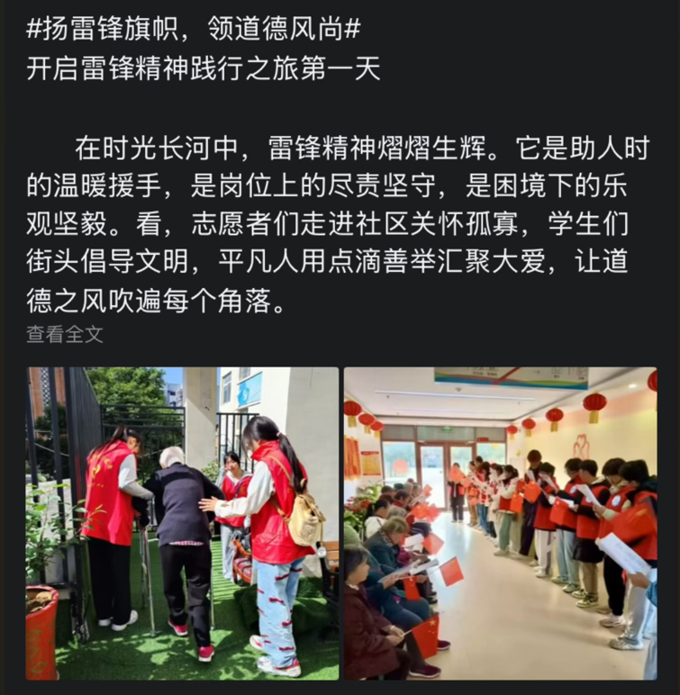 活动依托QQ空间搭建线上平台,参与者在活动期间每日上传一篇助人为乐、志愿服务、环保行动等善行图文,通过#扬雷锋旗帜,领道德风尚#话题分享实践感悟。参与者发布的日行一善内容涵盖辅导作业、光盘行动、校园垃圾分类、志愿清扫等多样化实践场景,通过身体力行后感悟心得的方式形成“打卡-分享-互动”的良性循环。24级余同学表示:“雷锋精神不仅是轰轰烈烈的壮举,更是融入生活的点滴关怀。”