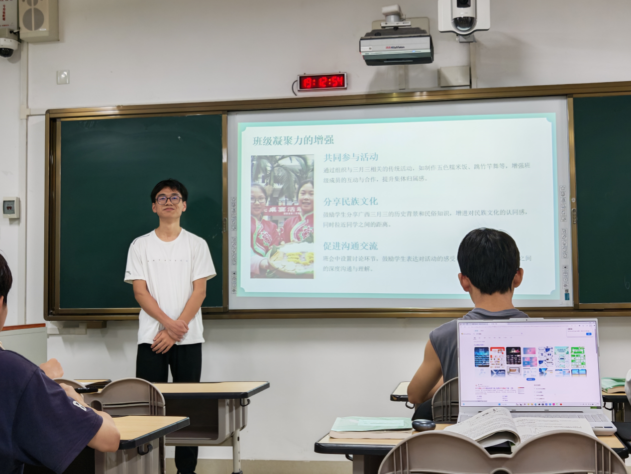在班会上,各班通过视频讲解、习俗分享等方式,从“广西三月三”和清明节的传统习俗和文化内涵中,挖掘与如和谐、友善、敬业、诚信等社会主义核心价值观相关的内容,引导同学们在日常生活中践行社会主义核心价值观,树立正确的价值观和人生观。组织同学们讨论如何在新时代传承和弘扬优秀传统文化,践行社会主义核心价值观,鼓励他们积极参与社会实践活动,为社会发展贡献自己的智慧和力量。