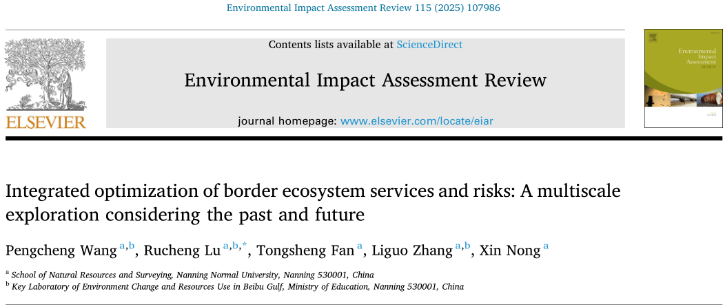Environmental Impact Assessment Review(中科院一区TOP,SSCI-Q1、EI)发表了题为“Integrated optimization of border ecosystem services and risks: A multiscale exploration considering the past and future”的研究论文。文章聚焦于边境地区独特地缘政治单元,耦合系列区域差异与时空映射模型,从多尺度识别并模拟生态系统服务-风险,进而建立生态安全区域的集成优化方案,提出系列政策建议,为全球边境生态安全的协同治理提供一定参考。该文由陆汝成教授为通讯作者,硕士研究生王鹏程为第一作者共同完成。