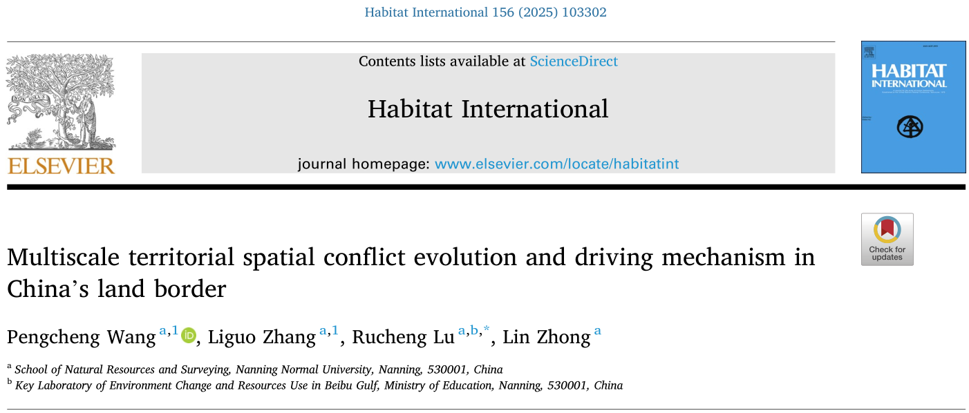 Habitat International(中科院一区TOP,SSCI-Q1)发表了题为“Multiscale territorial spatial conflict evolution and driving mechanism in China’s land border”的研究论文。文章构建空间冲突测度模型,采用转移强度图谱、空间计量模型、最优参数地理探测器揭示边境国土空间冲突的演化趋势与驱动机理,并提出边境空间冲突调控路径。该文由陆汝成教授为通讯作者,硕士研究生王鹏程、张利国博士作为共同第一作者完成。