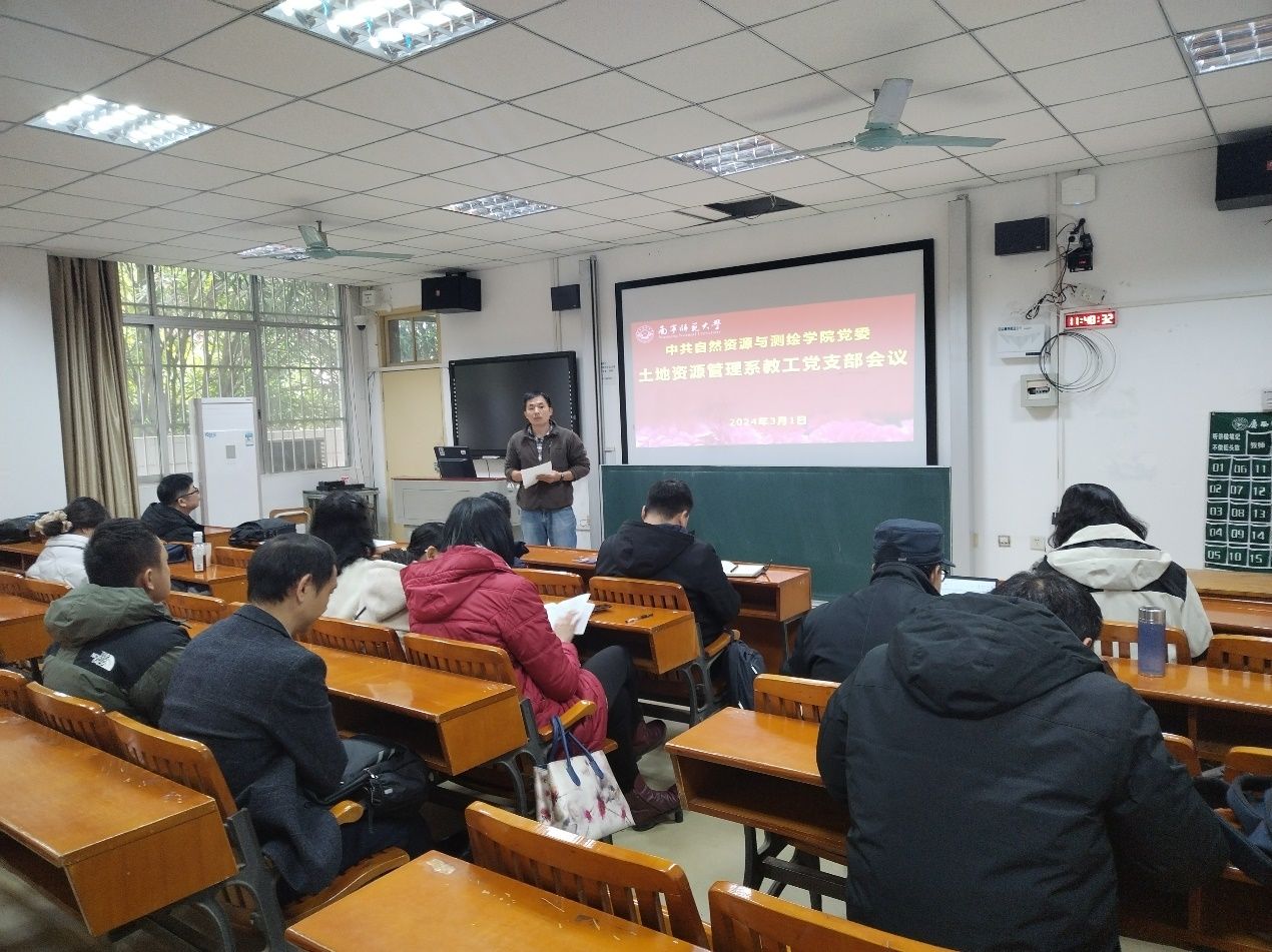 土管系教工党支部书记陆一敢同志,宣布了土地资源管理系党支部年度工作计划。他指出,2024年支部将围绕学院中心工作及学科专业建设,坚持党建赋能,以“党建引领专业建设高质量发展”为目标,推动党建与业务工作深度融合,更好服务专业建设、课程建设、教材建设、教学改革研究以及本科教育教学评估等工作,推动专业建设的全面发展。